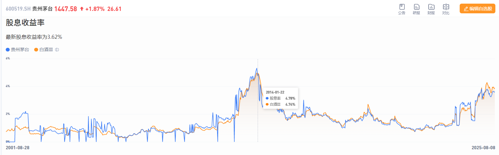 嗯,再看下茅台,怎么都得有茅台做个比较吧: 当下股息率3.62%,不算很高。但是比绝大多数银行理财强啊,本金还很安全,那你说是不是。