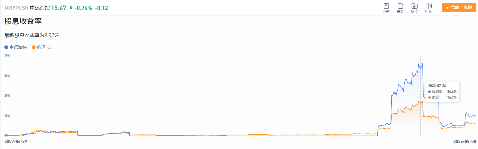 2023年股息率一度高至34.4%! 也就是说,当时你100元钱买中远海控股票,分红是34.4元。