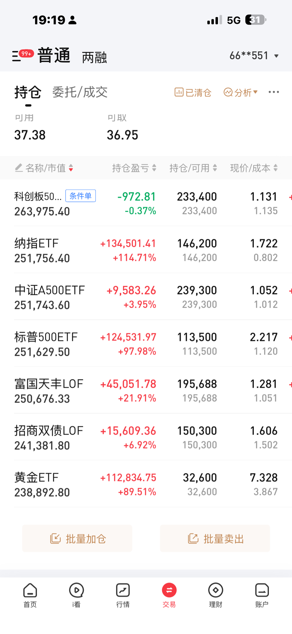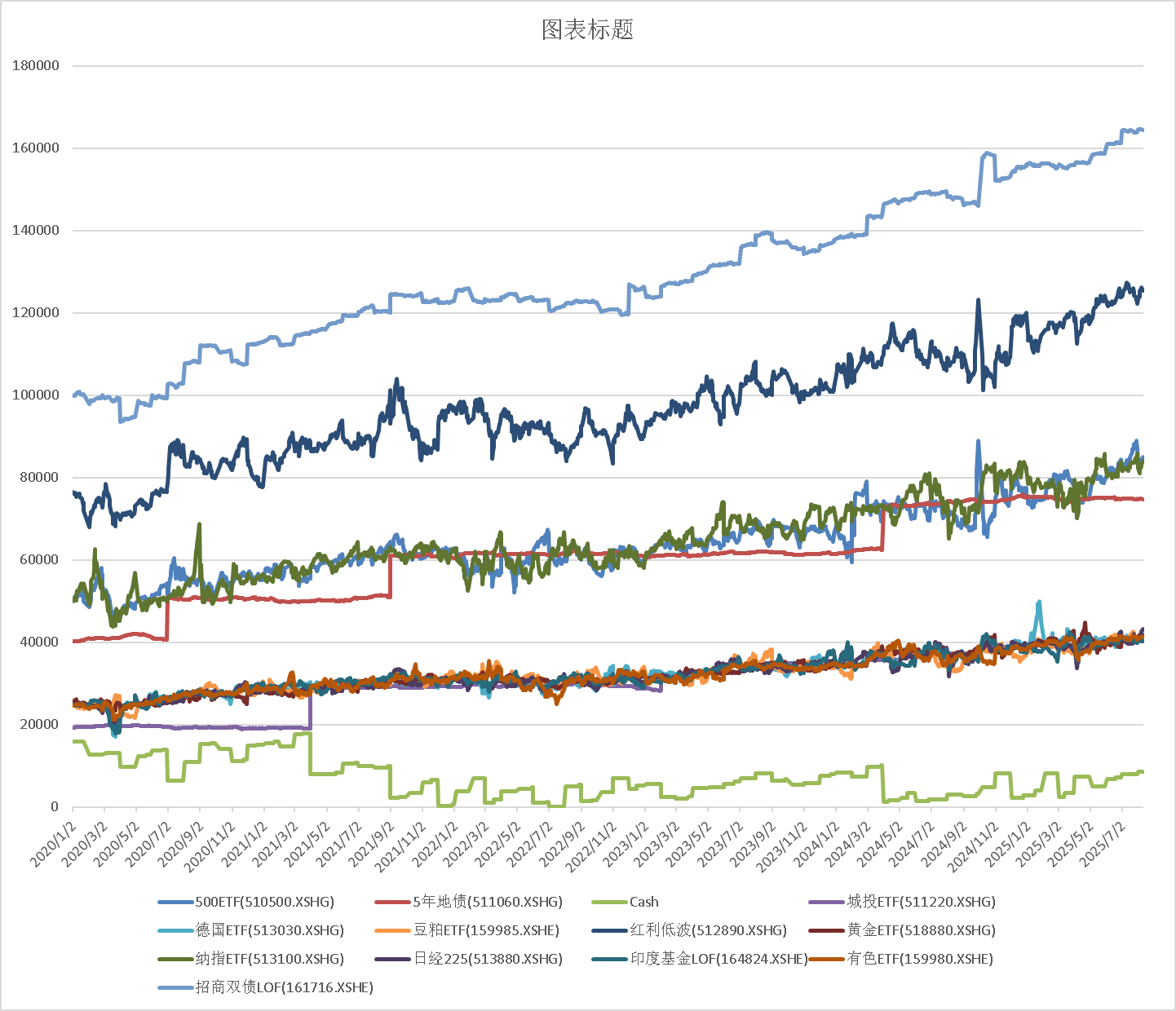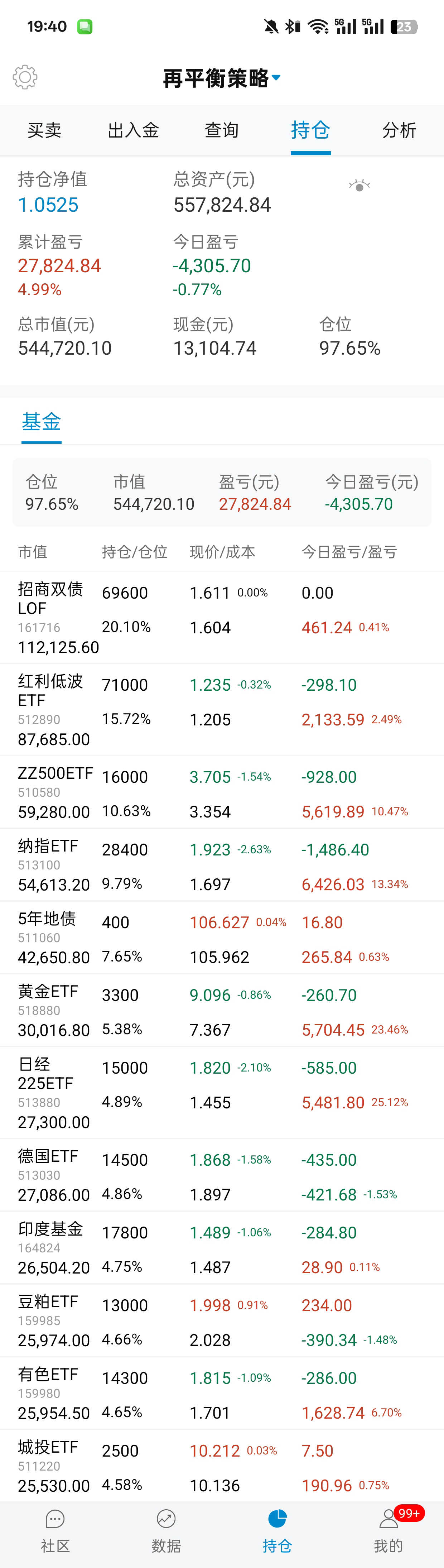 我一个帐户有类似的配置。各ETF等权。A股两只,美股两只、债两只、黄金一只。大致每月平衡一次。把市值最高的和最低的平均,其他品种不动。科创板建仓在高位,还是绿的。其他红的。本来配置的债是30年国债ETF等的,但价格太高,不利于动态平衡。