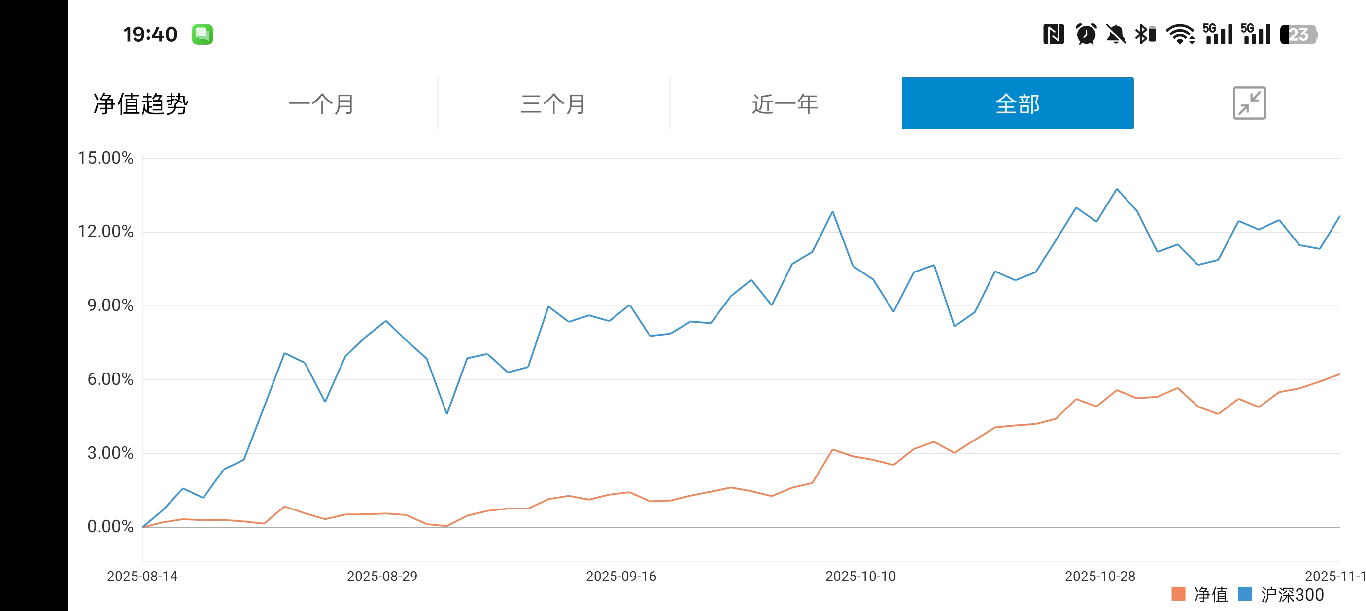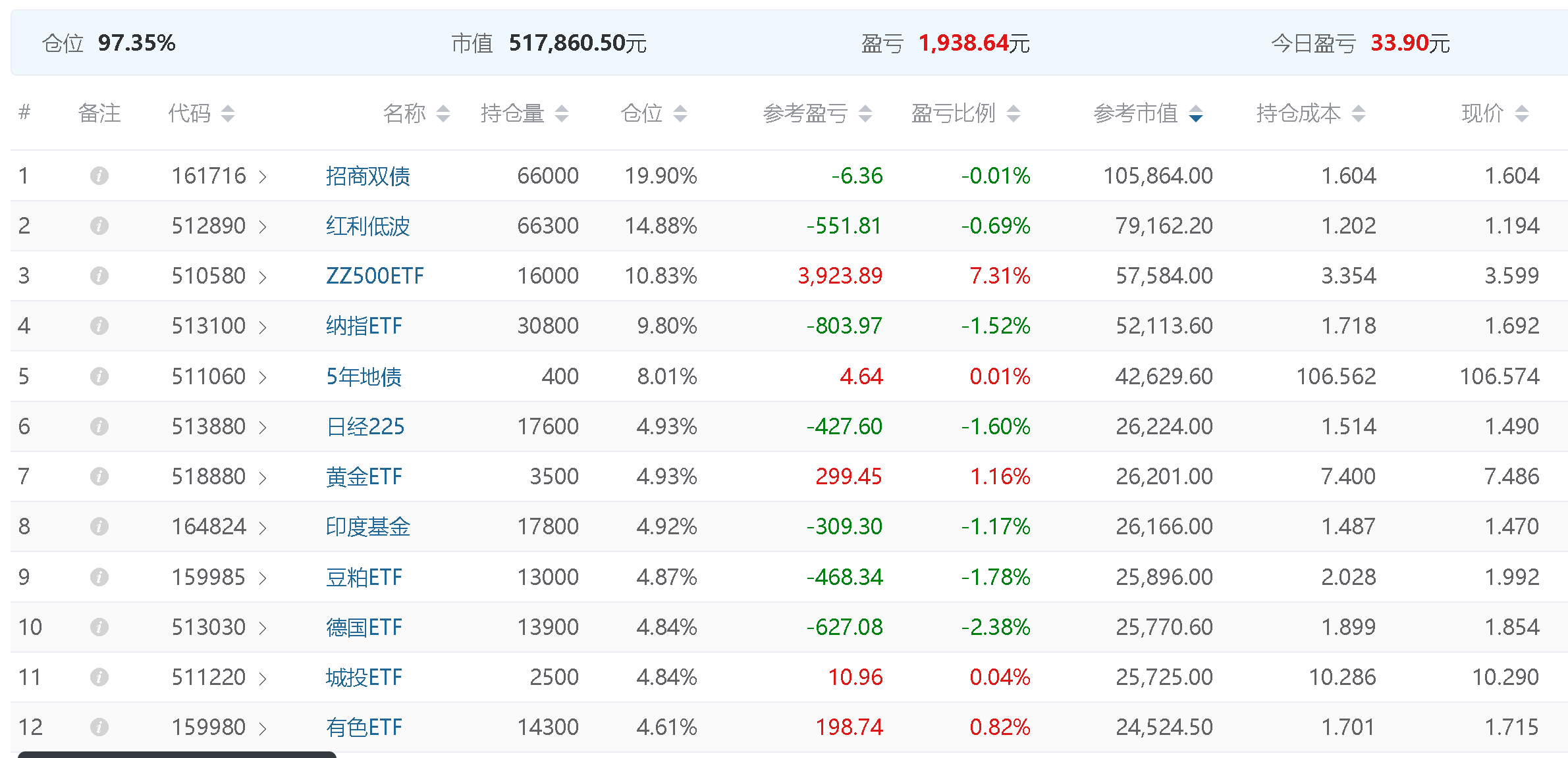 持仓净值:1.0037总仓位:97.35%累计盈亏:1,938.64元下个月继续加油!持仓比例比较均衡,下个月可能会卖出部分500etf,其他的稍微补点。还是要看交易成本,资金量小了很尴尬。