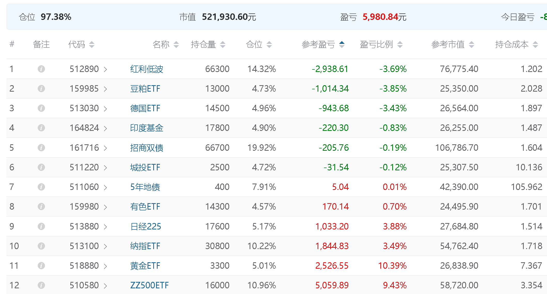 亏损最多的是红利低波,其他账户单独加仓了一部分。
