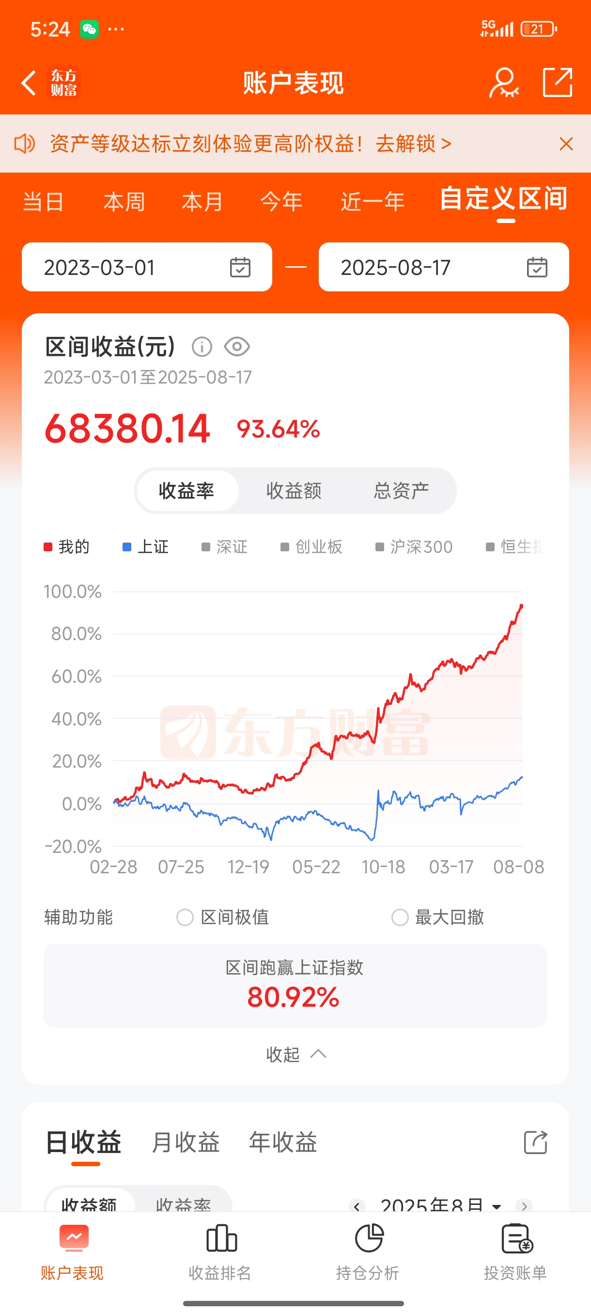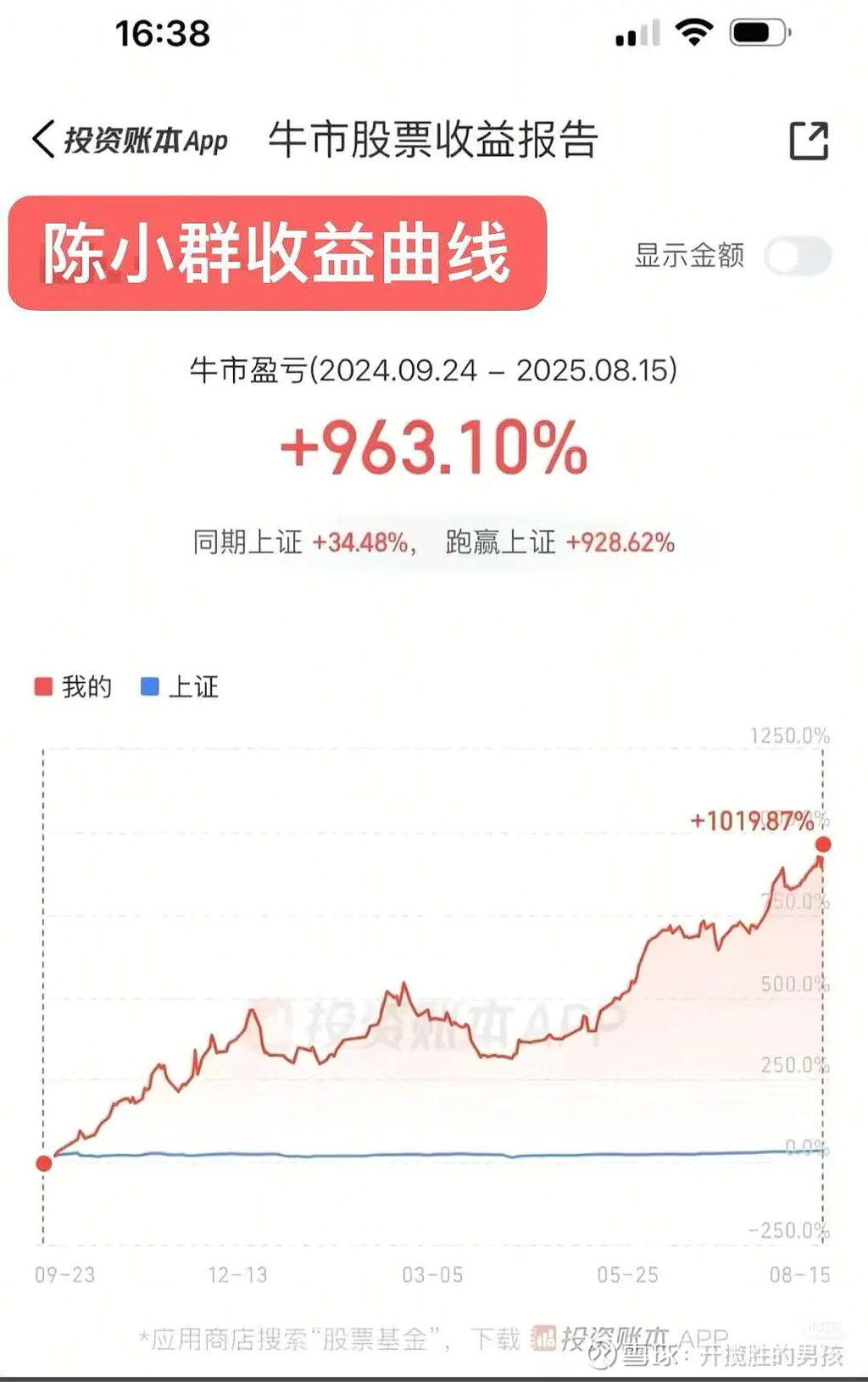 都是牛市给的罢了。另外23年到现在80%,在现在人均股神面前,应该是不好意思拿出来看的。没看到周末游资陈小群朋友圈截图:去年924到现在接近十倍吗?