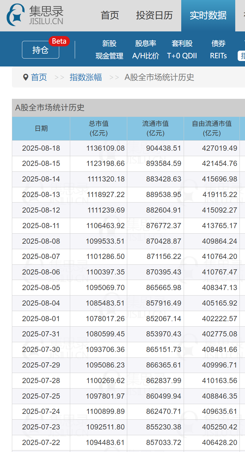 今天到处都是总市值突破100万亿的消息,可是看集思录A股总市值已经113万亿了呀,6月以来就没有低于100万亿。