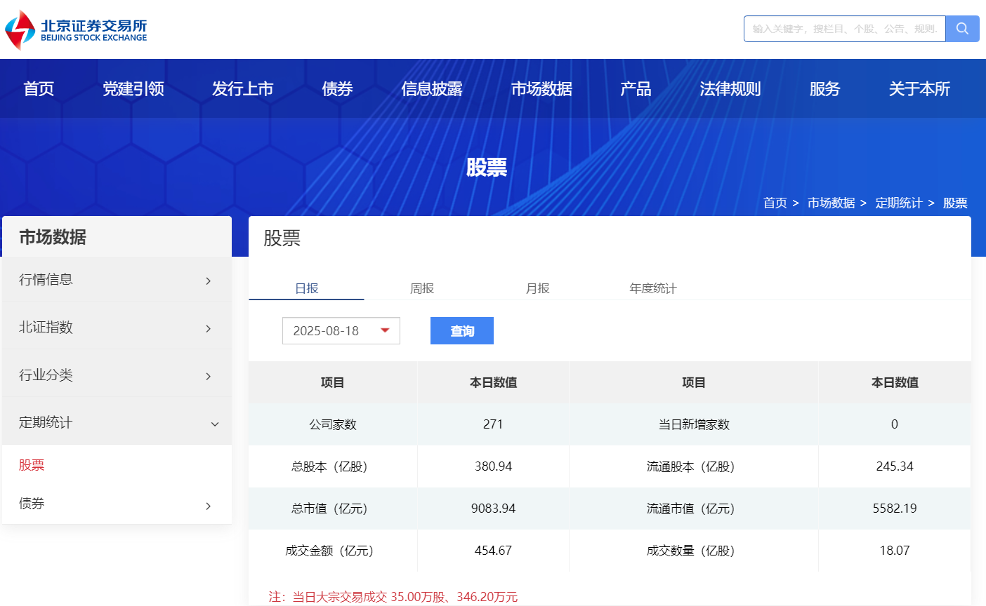 2025年8月18日,北交所股票总市值9083.94亿元,股票数量271只。