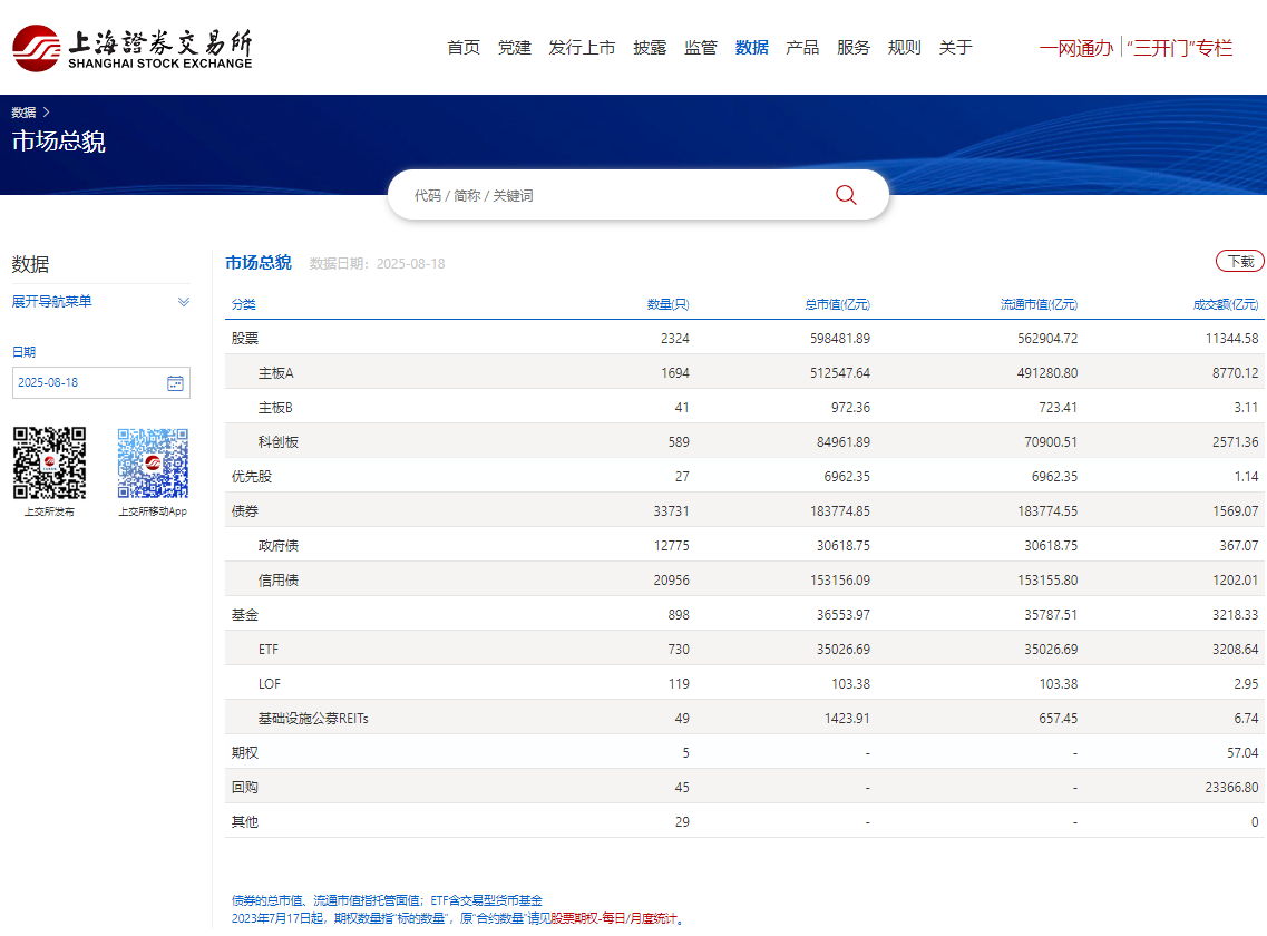 2025年8月18日,上交所股票总市值598,481.89亿元,股票数量2324只。