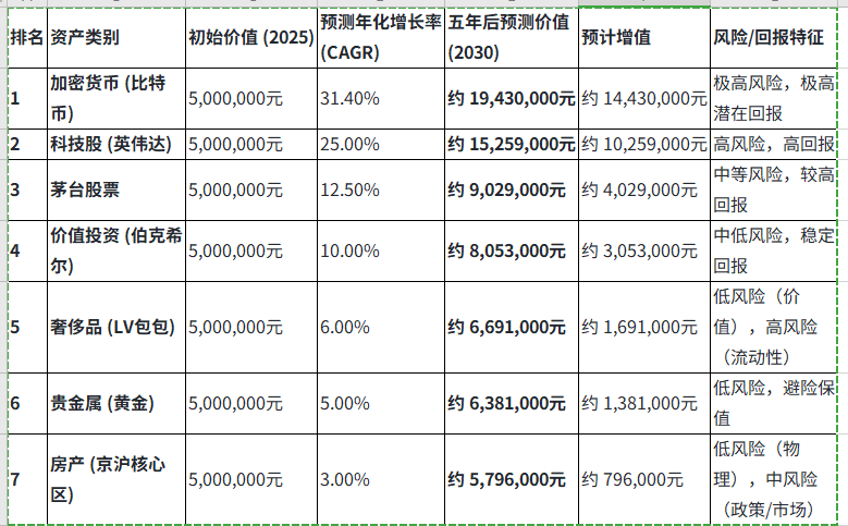 一个特别有意思的话题,就是5年后哪类资产最值钱或者最不值钱,以7类当前价值均为500万的资产为载体,考验认知与眼光;