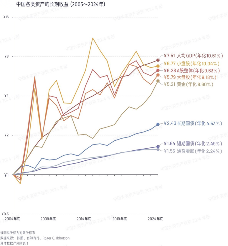 上文提到国内的股票市场由于种种原因,市场参与者交易方式等原因,导致投资者较难赚到钱。但通过有知有行制作的中国各类资产的长期收益(2005-2024)图表,