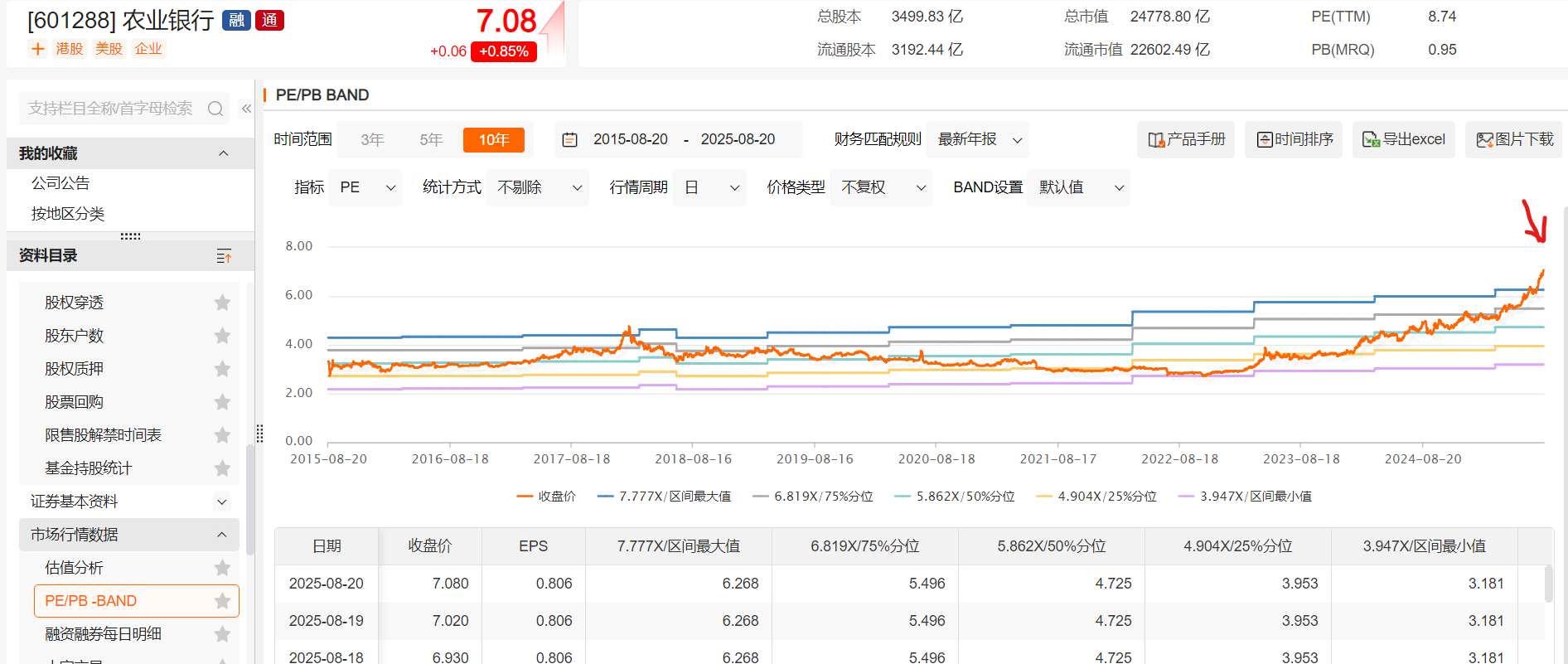 我看了下其他软件的pe和pb band,显示低于中位数,意思是中等区间