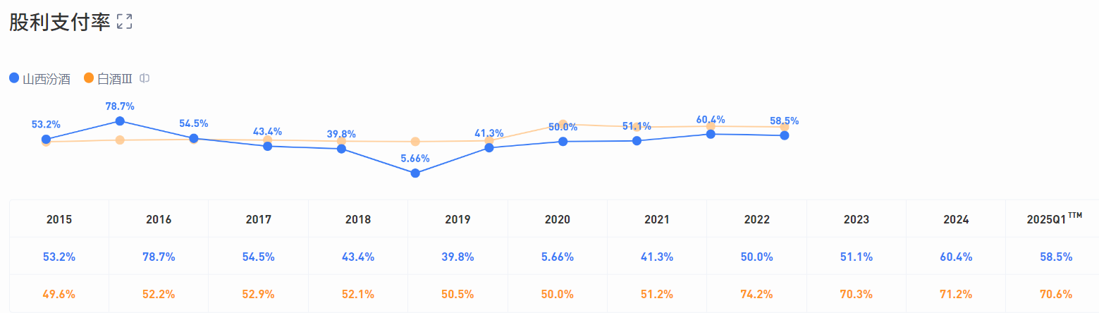 高分红率,没大毛病。近几年分红率在50-60%,历史多年基本都在40%以上。虽然和白酒行业的接近70%的行业平均分红率相比,不算高,但是从投资的角度,相比非白酒的企业,依然是足够好的。