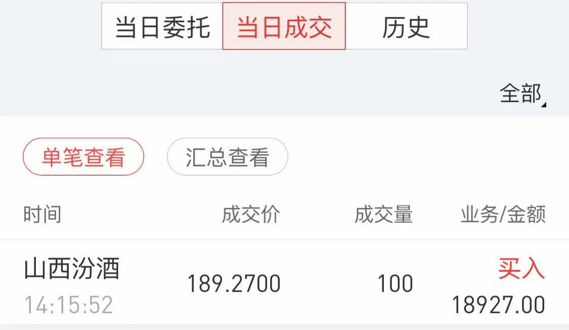 这段时间攒了点儿银子,必须用真金白银证明自己的观点。遂买入一手山西汾酒(600809.SH)。