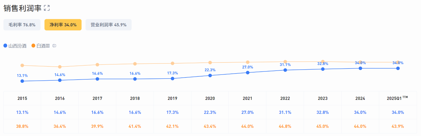 高利润率,没毛病。毛利率76.8%,净利润率34.0%,托行业的福,白酒依然是A股里商业模式最好、利润率最高的行业之一。