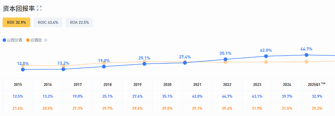 高ROE,没毛病。是A里非常高的。ROE 32.9%,历史从2015年不高的12.5%,一路大力提高到2022年的44.7%,近两年有所回落,但是依然不低,依然是大A里较高的ROE。汾酒的ROE也高于行业平均的29.3%。