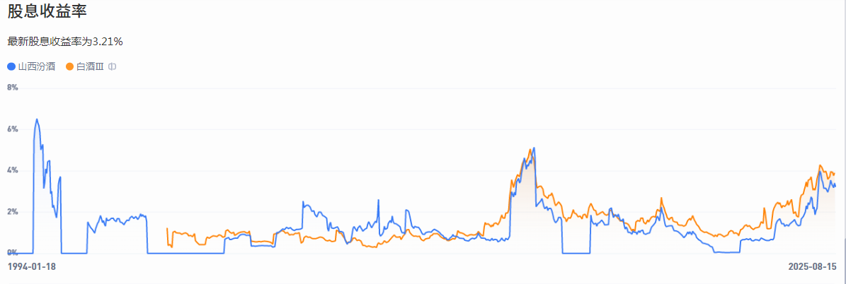 高股息率,没大毛病。目前股息率3.21%,是汾酒自己的股息率高位(如下图可见)。