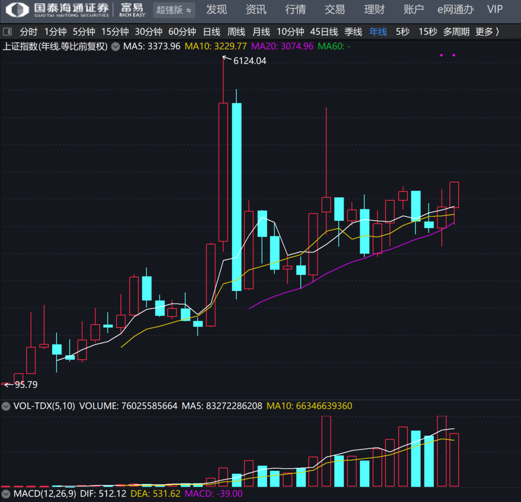 先上一张上证综合指数年线图,图片显示无疑是走在大型的长期上涨趋势之中。