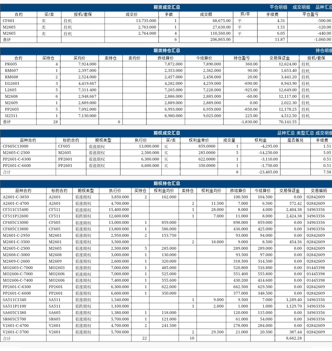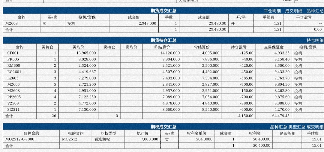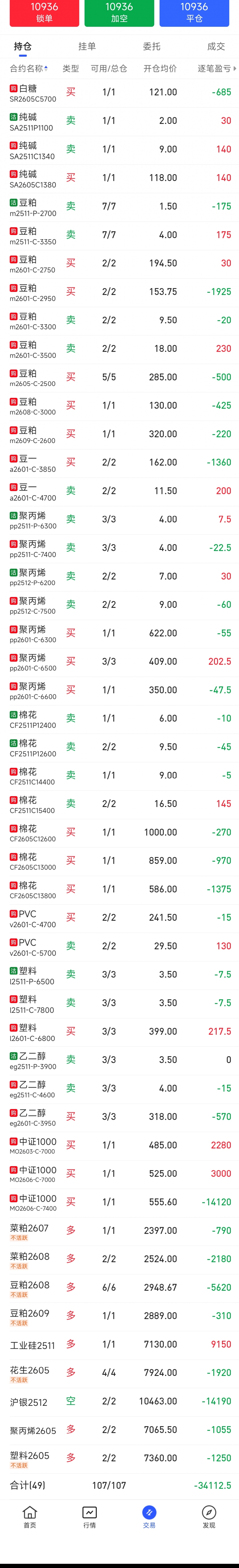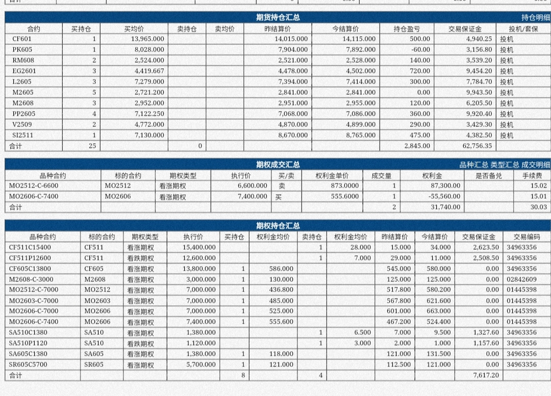 由于近期市场涨幅太高,周一将深度实值6600看涨期权平仓,重新开仓平值7400看涨期权控制后期指数调整时的回撤。今天减仓了一手中证1000实值看涨期权控制一下风险,后期如果出现大调整再开回来,如果没有就再有持仓跟涨也行,近期随着冲高会陆续减掉一部分仓位,加仓一部分在低位的商品期货,比如豆粕,菜粕,花生,塑料,乙二醇等。