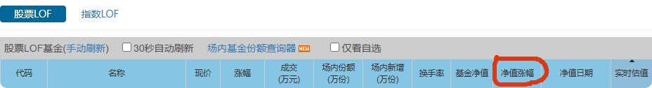 建议增加LOF数据中“股票LOF"的"净值涨幅"数据 ,目前只有“净值数值”没有“净值涨幅”的数据,本来”股票LOF”误差就大,每次看净值涨幅还要到天天基金上去看很不方便,建议增加“净值涨幅”数据