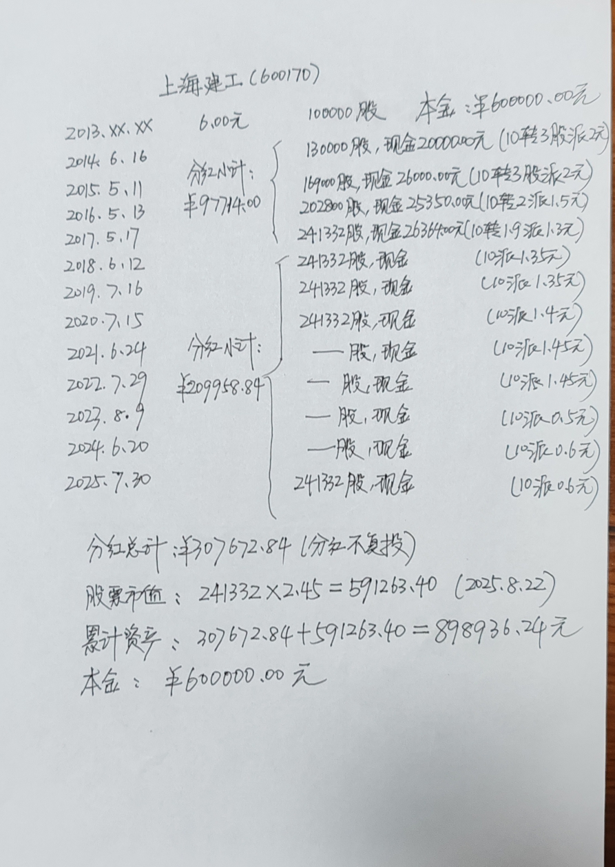 根据上海建工历年分红送转公告信息,计算过程和结果如上图所示,结果是盈利近30万。大家品品,请细品品。