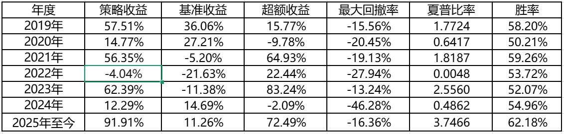 2025年至今策略收益:91.91%,表现非常出色。基准收益:11.26%,策略明显优于基准。超额收益:72.49%,策略收益大幅超过基准。最大回撤率:-16.36%,风险控制较好。夏普比率:3.7466,风险调整后的收益非常高。胜率:62.18%,胜率较高。