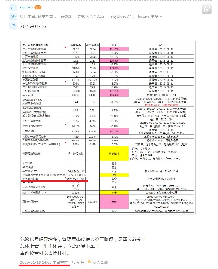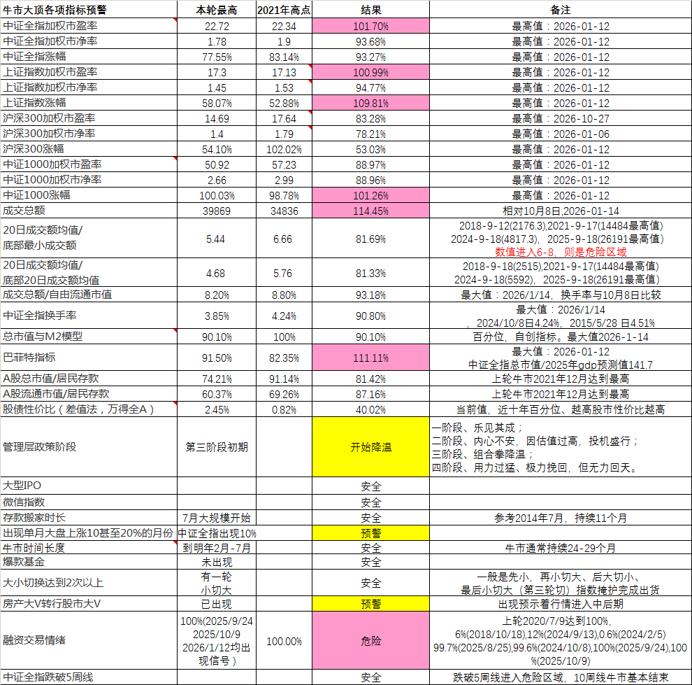 我们还是看数据,本轮行情多数指标在2025年10月9日前后达到最大,同21年比较,只有市盈率、巴菲特指标、单月最大涨幅、融资交易拥挤度等指标发出了预警。而最重要的市场情绪指标、牛市持续时间长度、涨幅、估值(除市盈率)等均未到达预警水位。21那轮牛其实算不上什么大牛,个人觉得牛市各项指标不应该比那次低太多,至少要接近,对吧!