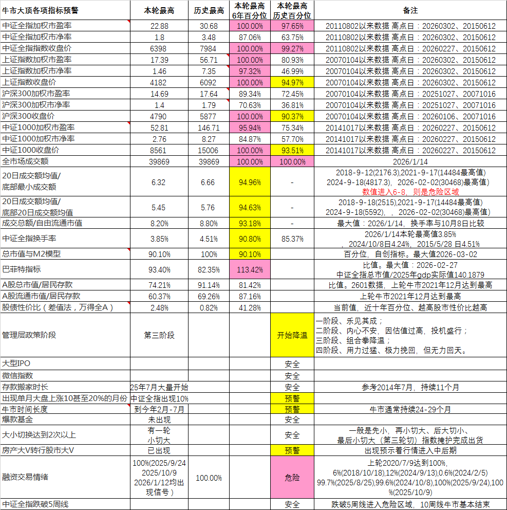 目前看有两项指标超出了95%,出现了预警。当然这仅是同上一轮牛市比较,等空了再补充2015年大牛市的数据!