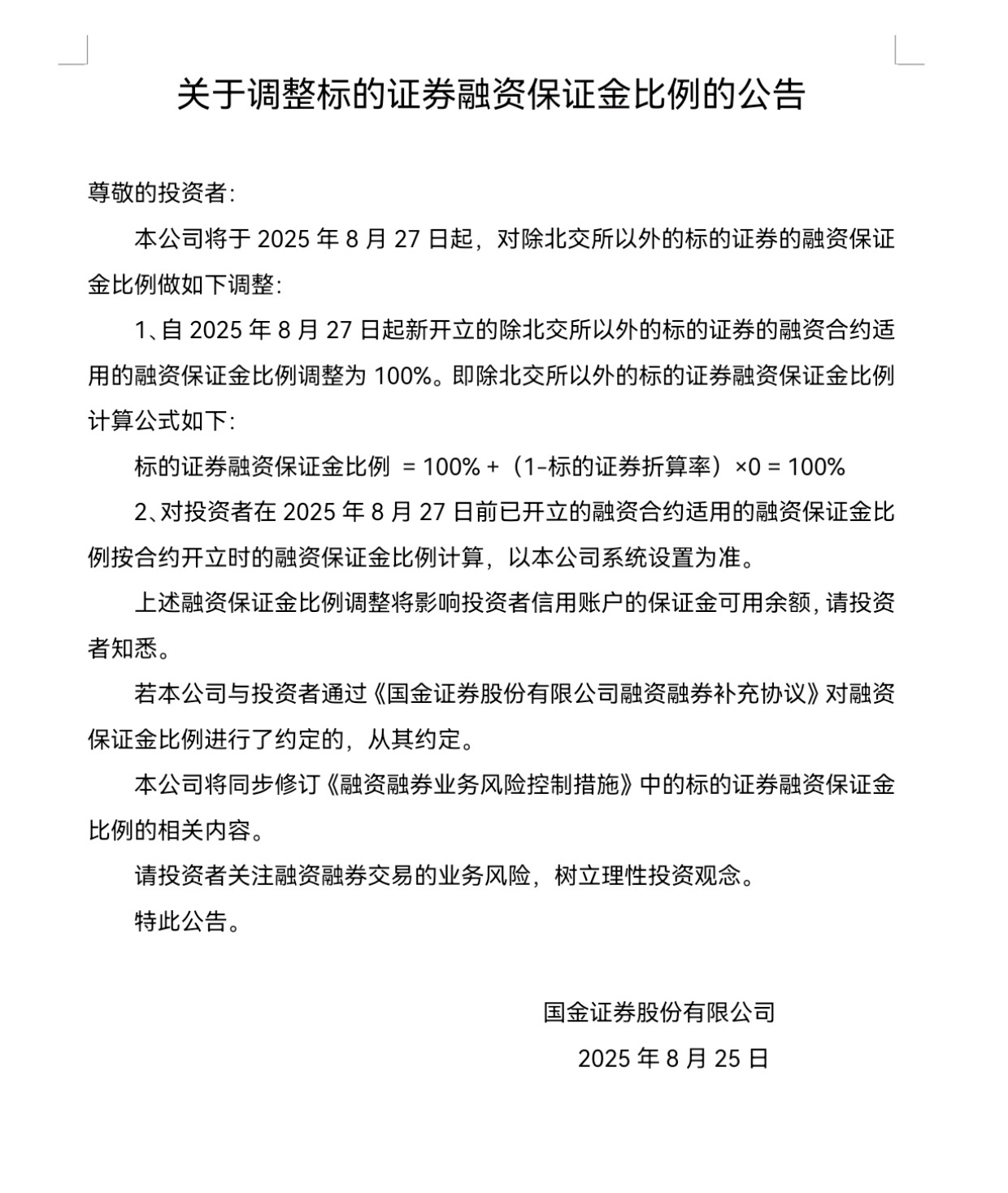 此次调整是国金证券基于自身经营杠杆的考虑,目前并无全行业统一调整的通知。关注是否有其他券商跟进。