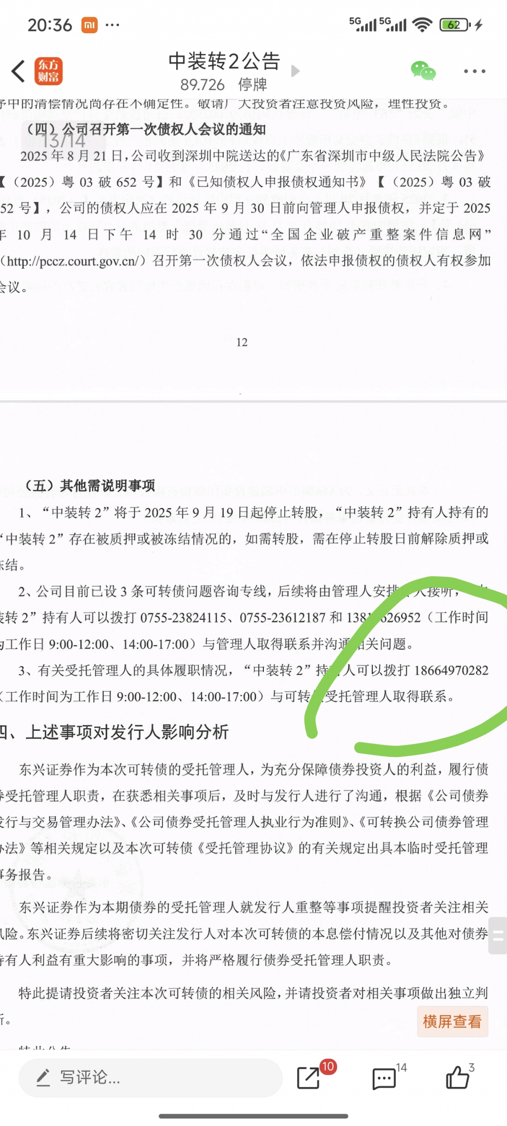 今天下午我给中装可转债受托管理人打电话占线,后来给我回电话了,我的诉求是在18号前把小额多少公告,我们多出来的可以转股减少损失。如果不公告,那么我几个账户受到损失会投反对票。受托管理人说他现在就在上市公司,正督促上市公司先把小额多少先公告。