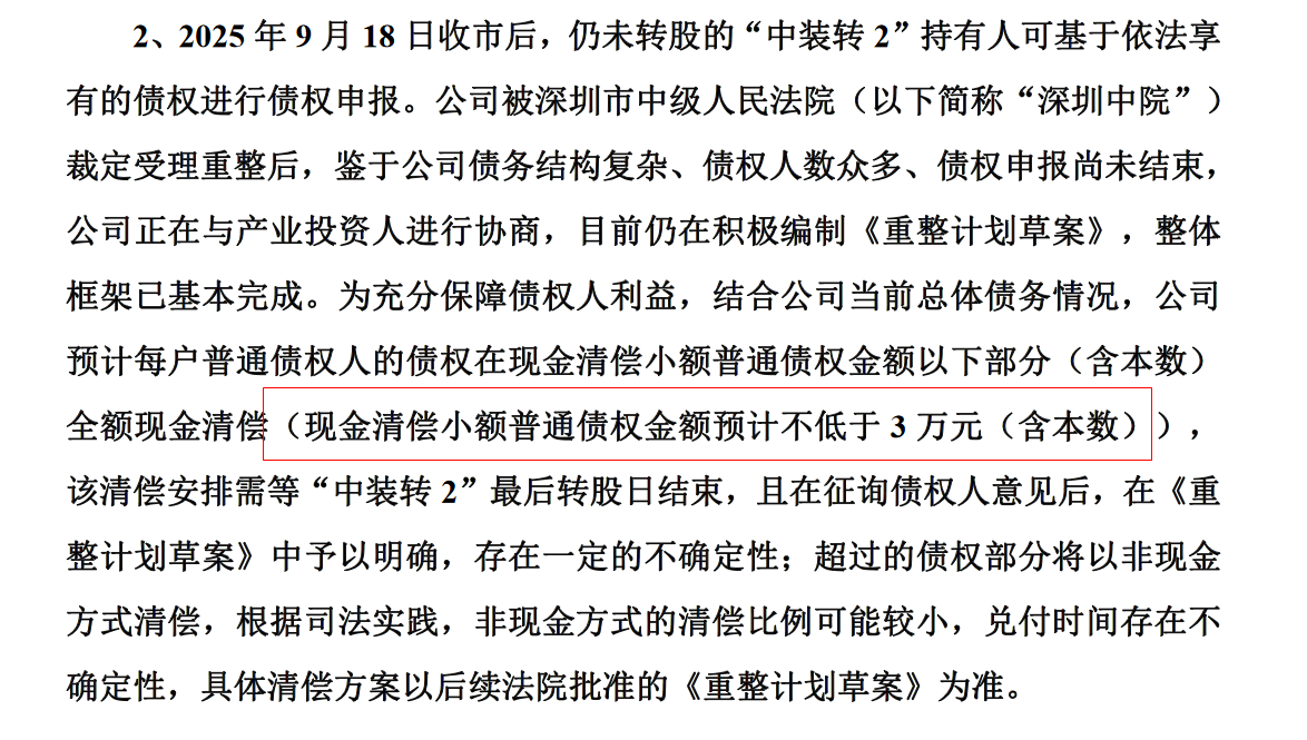 该清偿安排需等“中装转2”最后转股日结束,且在征询债权人意见后,在《重