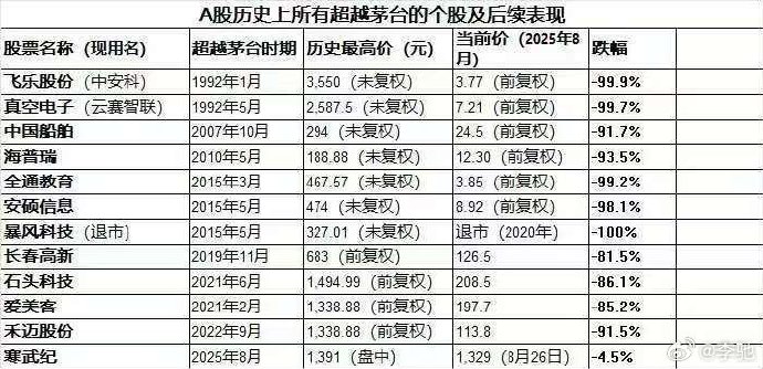 看到是李驰发的图我就呵呵了,数据好多错误。总共十二支票一半有问题,暴风退市懒的查数据了,92年茅台没上市,头两只就不对,长春高新、石头科技、爱美客、禾迈股份四支票股价从未超过茅台这个图与其当作事实,不如看成观点