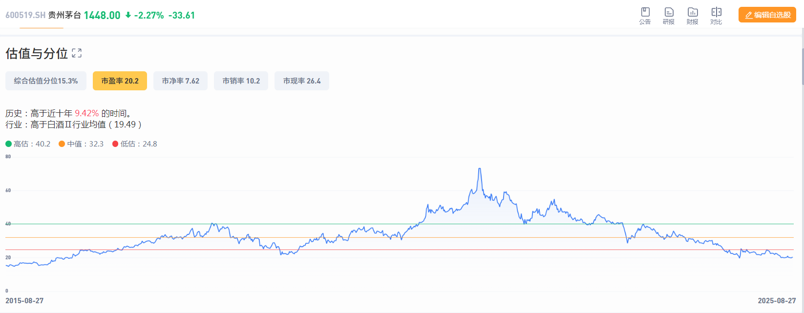 再简单讲一下,就是茅台20.2,处于过去10年估值区间的低于10%百分位的低位。