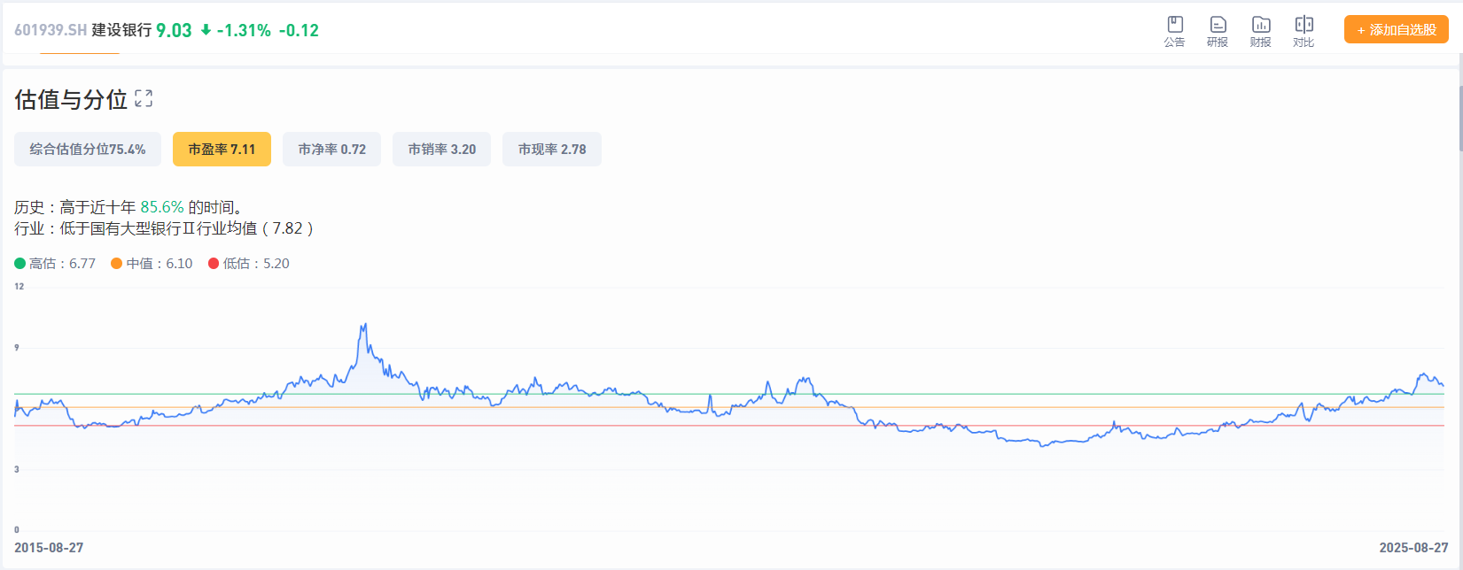 好,好,我们再看个建设银行(601939),去年以来涨得非常好,目前PE只有7.11,不高吧?低于10啊。