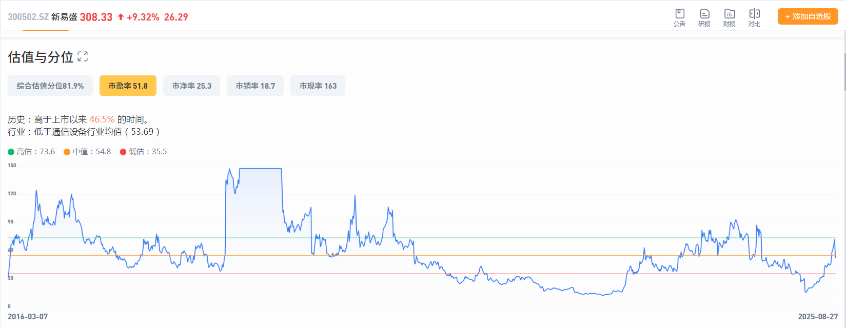 5)注意:PE百分位、PE必须都低,必须结合起来看。有一个高,都要谨慎。借用一个读者问过的股票新易盛(300502)解释,10年PE估值百分位46.5%,应该说百分位不高,比超过一半的时间PE都低嘛。但是绝对PE值,51.8,绝对不低。你看TA历史PE高高低低的大幅波动,并且今天一涨就是9.32%的,这个至少不是一个很稳妥的价值投资标的。