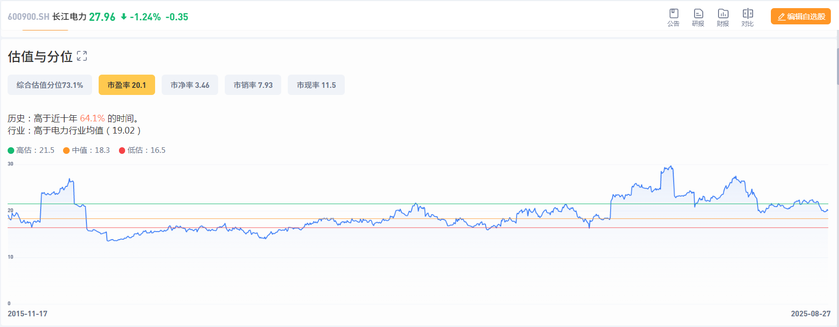 比如长江电力(600900),水电大白马,妥妥的价值长牛股,市盈率恰好也是20.1,和老茅差不多。低吗?