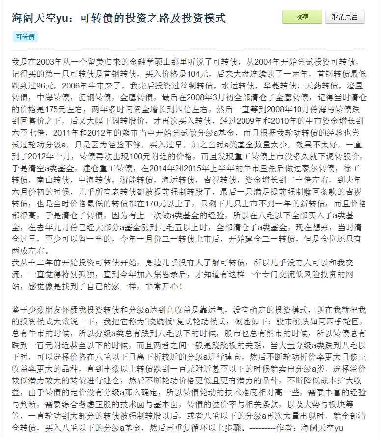 要知行合一,千万不能被胜利冲昏头脑。最忌热血沸腾你可能加入集思录的时间比较晚,对我不太了解,下面是我2016年3月在集思录发的第一篇帖子,这个帖子应该也是集思录上最早明确提出可转债轮动的帖子,因为时间太早,现在集思录上已经查不到了。