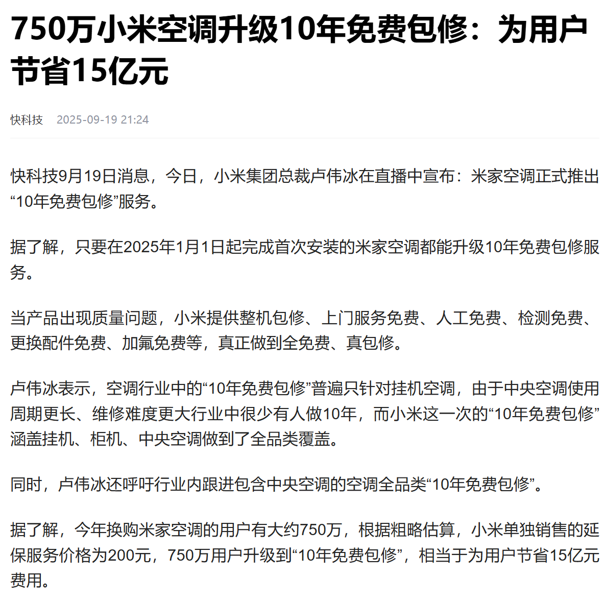 小米刚刚也官宣提供10年包修了。大家怎么看?这能说明小米质量跟格力相当吗?至少说明小米在努力提高质量,格力遇到了一个强劲对手。周一的股票估计要下跌了。