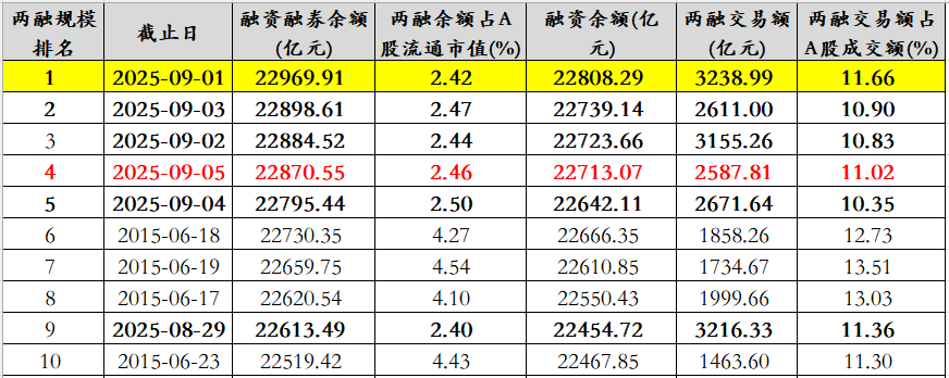 9月5日,A股两融余额22870.55亿,较昨日新增75.11亿,两融规模历史排名第4位。自9月1日两融规模创历史新纪录以来,9月份两融规模持续保持在2015年峰值之上。