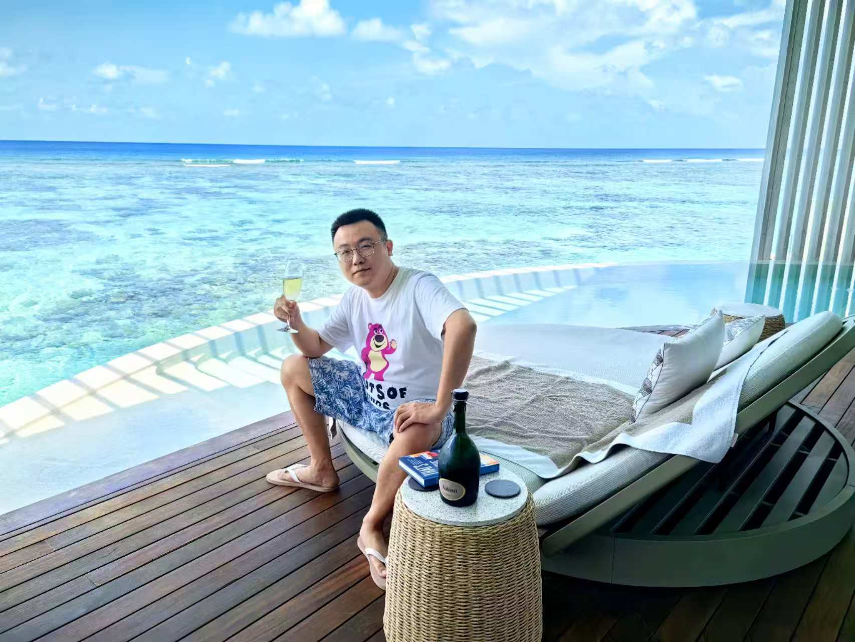 在马代的前两天,算是彻底开启了“炒股+躺平”的模式,每天先把股票交易完,一看时间,好家伙,都当地快11点了,先去餐厅吃一顿自助,吃饱喝足回别墅补觉,就这么吃了睡、睡了吃,。下午,去玩免费的非机动水上运动,浮潜、划皮划艇。后来几天不是交易日还腾出时间,坐船去外海浮潜,总算兑现了好好玩、多拍照的承诺,一个船就4个人出海,等几人下水,船就在旁边时不时开开停停,并排跟着走,保驾护航,看着就特安心。教练带着救生圈在水下领着,顺着海里的山坡,往水渐浅、能看到珊瑚的区域游,一路慢悠悠的,主打一个轻松惬意。可谁能想到,好好的行程,被一个“自信姐”给搅和了。同行的有一个人,总觉得自己会游泳,逞能不穿救生衣,脚蹼也不穿,就连浮潜面罩都不会用,咱看着都着急。下水之后,他压根浮不起来,全程趴在救生圈上,全靠教练一路拉着走。咱戴着浮潜面罩在水下,一点都感觉不到海上的风和浪,可他趴在救生圈上,风吹浪打,没半个小时就扛不住了,估计教练也被他折腾得累坏了,好好的行程只能提前草草结束,属实有点不尽兴。回屋之后,我不死心,又在房间下面的水里浮潜了一会儿,可惜水里只有零星几条小鱼,特别大的鱼一条都没有,跟我预想的完全不一样。丽思这边每天都有不同的出海浮潜项目可选,珊瑚浮潜、海龟浮潜、鲨鱼浮潜、蝠鲼浮潜,尤其是鲨鱼浮潜我早就想试试了,结果咱排行程看得太晚,等反应过来想报的时候,最后两天赶不上鲨鱼浮潜的日期了,直接错过了!
