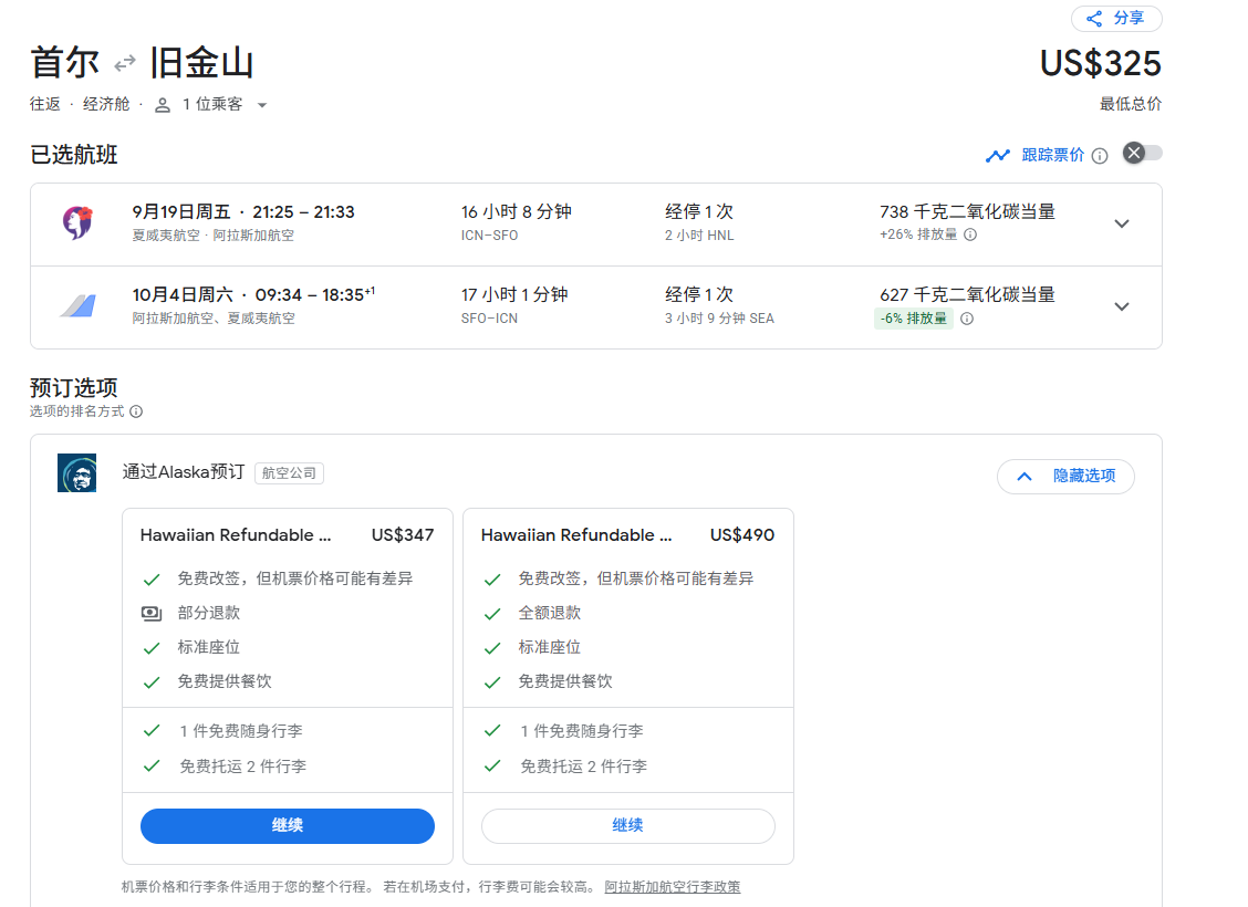 下面这张票,很多日期都有,首尔往返旧金山,仅2400多RMB,可以停留夏威夷和西雅图,再去美...