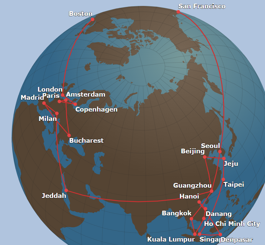 最远的,澳洲必须2选1,经新加坡去墨尔本,或者经吉隆坡去悉尼