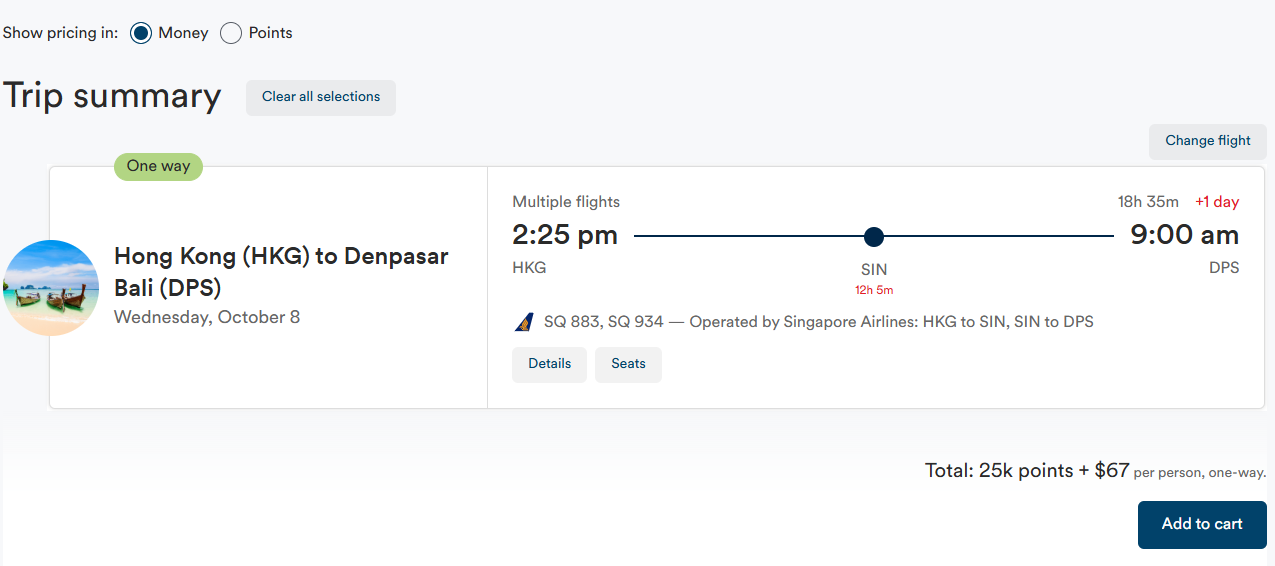 香港去东南亚任何一个有新加坡航空的地方,使用阿拉斯加航空积分(可买分,或者北美信用卡获得),商务舱25K+$67,大概相当于2900人民币吧。