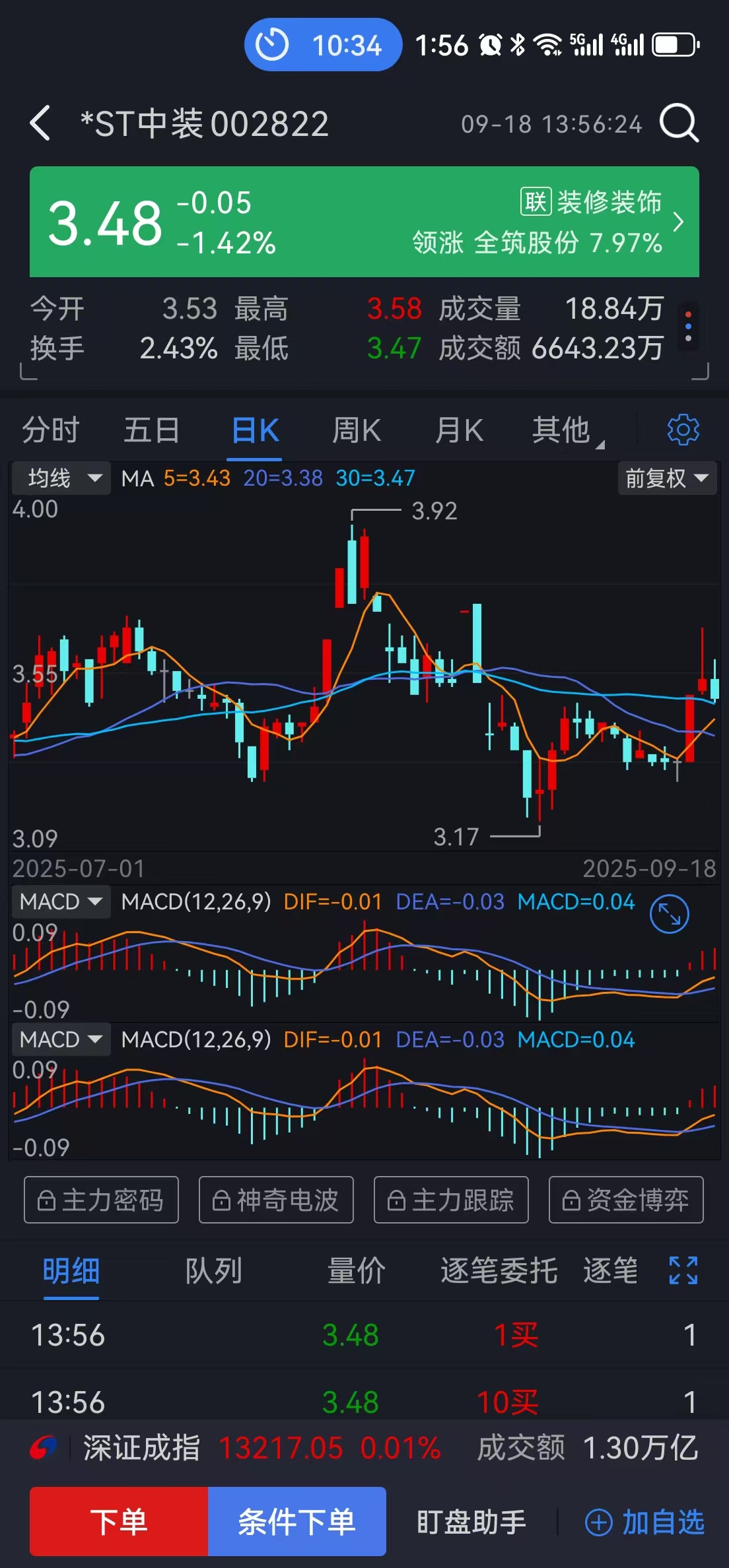 上午减 中贝 永吉 能辉 山石 崧盛 神通 等等,其中 神通 我手软了没舍得多卖一点,结果吃了15元大阴棒...