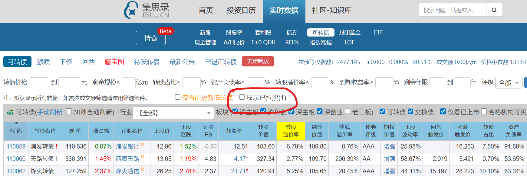 先勾选显示拉黑,然后点转债代码去转债详情页,然后有个拉黑的黑心点一下取消