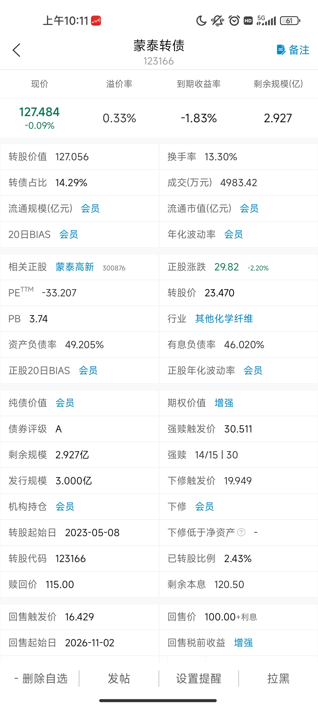 转债虽然只有2.9亿,但占比10%了,估计公司不一定敢强赎,就这样负溢价转股恐怕是解决之道。等哪天转债下来了再拉升宣布强赎也不晚。反正时间还来得及。