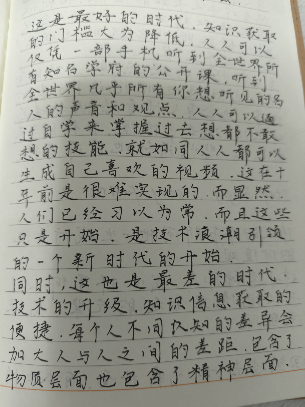 同时,这也是最差的时代,技术的升级,知识信息获取的便捷,每个人不同认知的差异会加大人与人之间的差距,包含了物质层面也包含了精神层面。