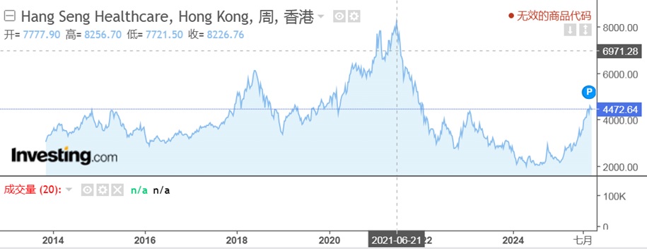 而后找到了恒生医疗保健指数,可以查到从2014年以来的走势图,大致能看出医药行业指数的长期走势状况。
