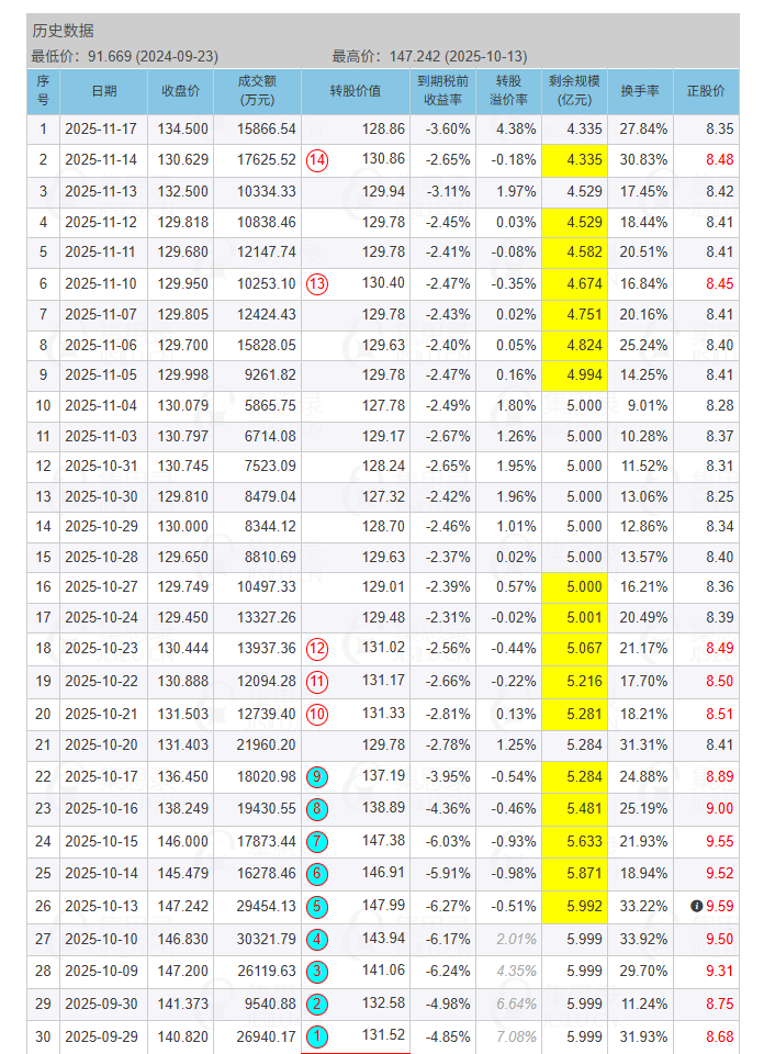 11月17日,也就是今天,前面的3天只有1天满足,如果今天不满足,这个周期就不能满足强赎了。而因为强赎的预期,优彩转债的溢价率已经从9%左右,降到了0%左右(11月14日)。如果今天股价不能达到8.43以上,这次的强赎计数就会失效,那么强赎预期消除也会导致溢价率重新回到之前9%左右,那么转债价格就会上去了。
