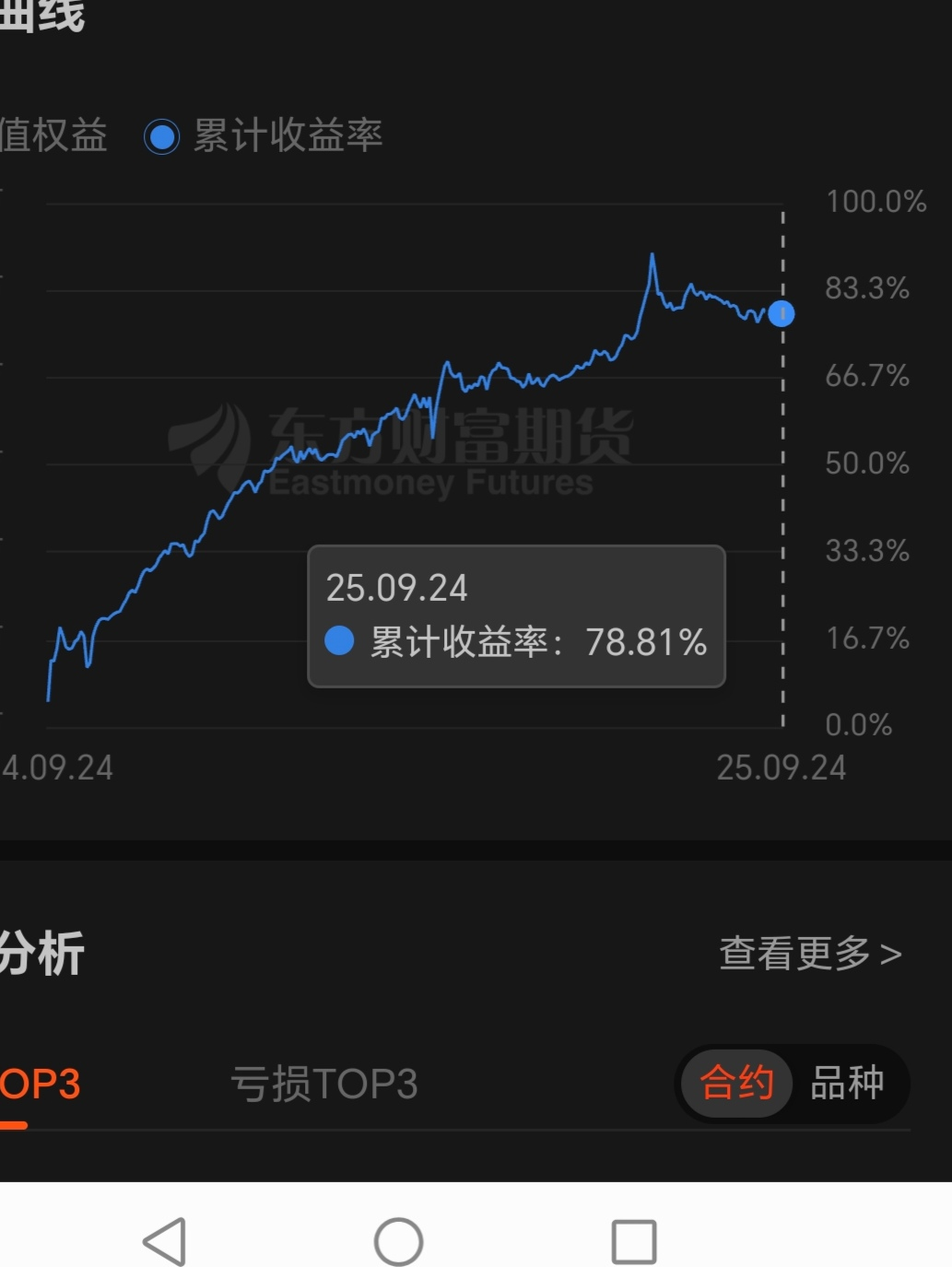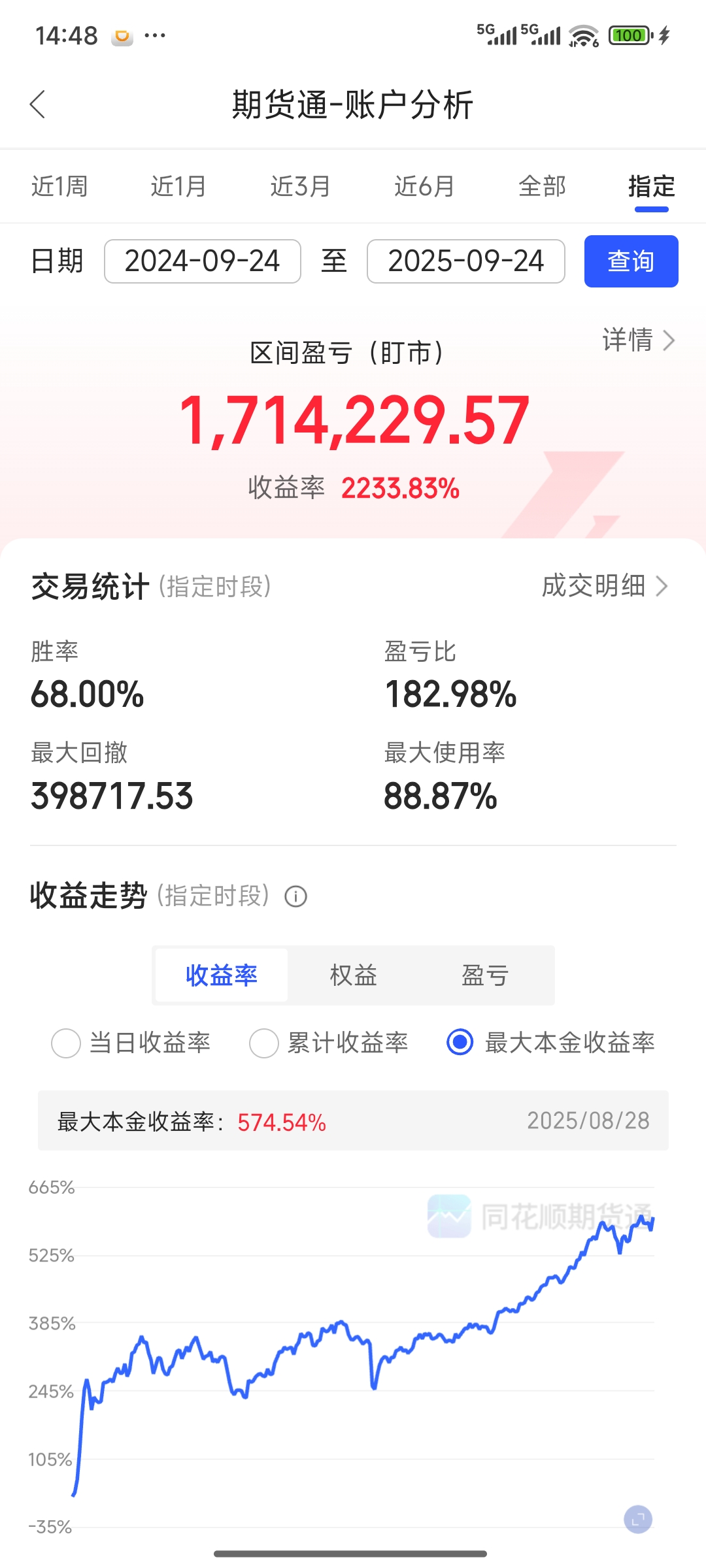 献丑了。ps:这个收益率并不准确,因为是期货,保证金很多是存在外面的,实际收益率远达不到这么高,账户用了大约3倍杠杠。 算是运气好抄到底了,自知无法复现,准备这一波过完就把杠杠卸掉,老老实实过点小日子。