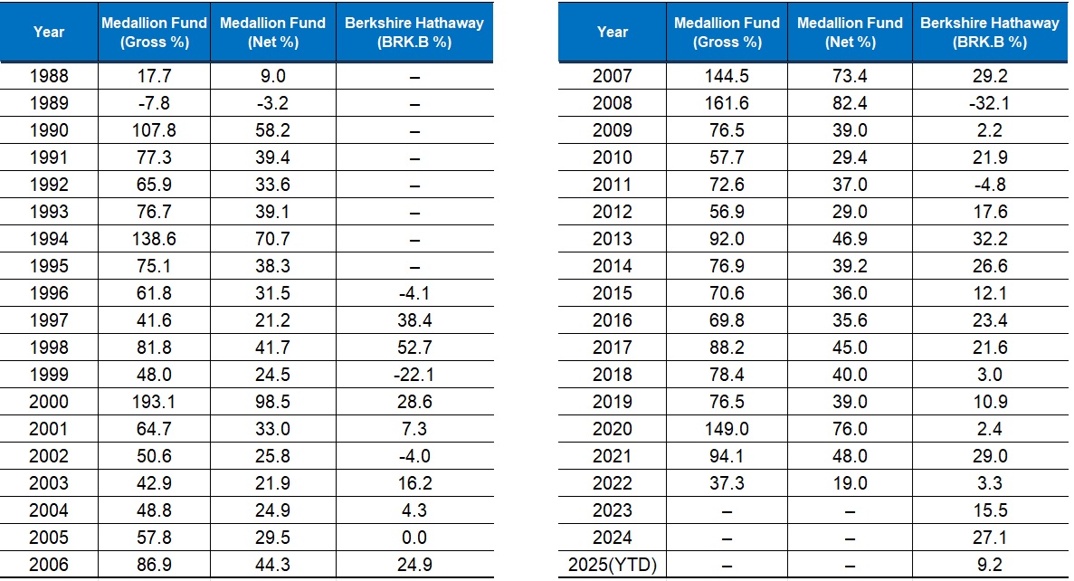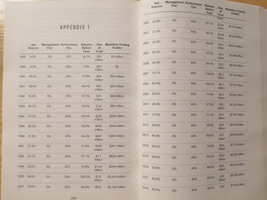 the man who solved the market: how jim simons launched the quant evolution (gregory zuckerman) 书里有关于medallion fund 收益的更详细的信息,如下。