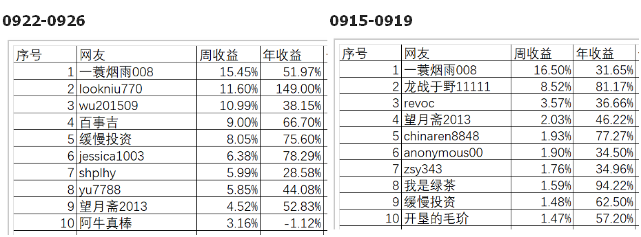 连续两周周收益第一,算是一件值得高兴的事,至少能一扫9月份前两周的阴霾,也算是对前阶段那次周排名倒数第一的复仇吧。