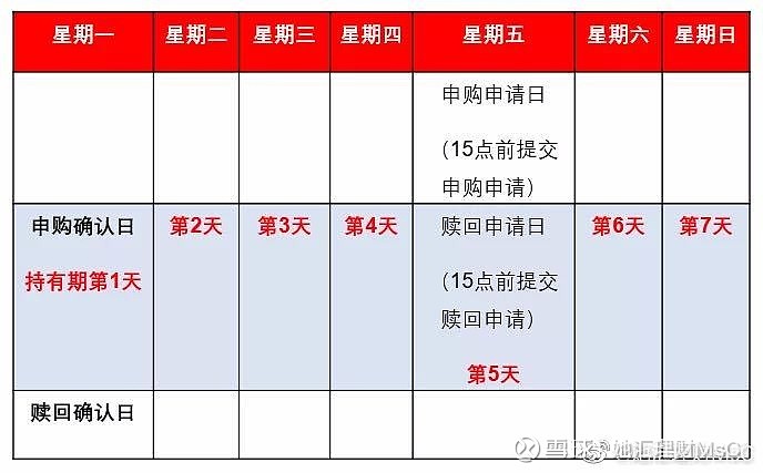场内赎回基金,通常是按照T+1个工作日确认,即比如9-30赎回基金会按照10-8为赎回确认日。比如说周一场内买入的份额,周五的时候办理赎回就满7天了。而周一申购的份额就要等到下周一才够7天。
