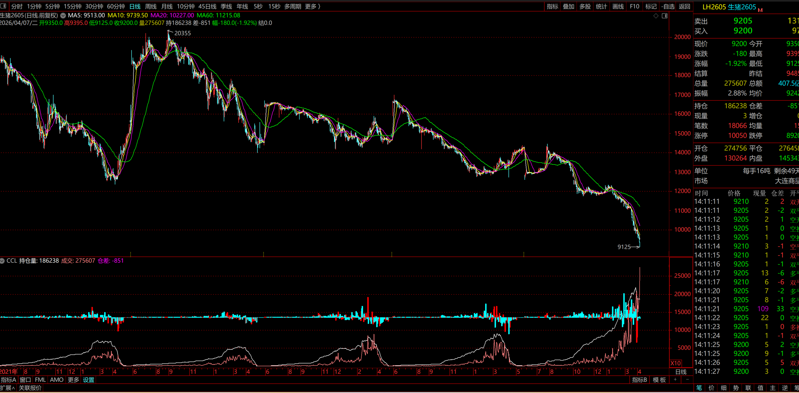 LH2607暴涨,只赚了一个零头就止盈了出局。没有目标位而已。07正常都会反弹到11元,或者07/09跨期小于1200的二肥点。目前因为整体猪价在水线下(12元),所以价差处于混乱期,这时候是07最好的时候。